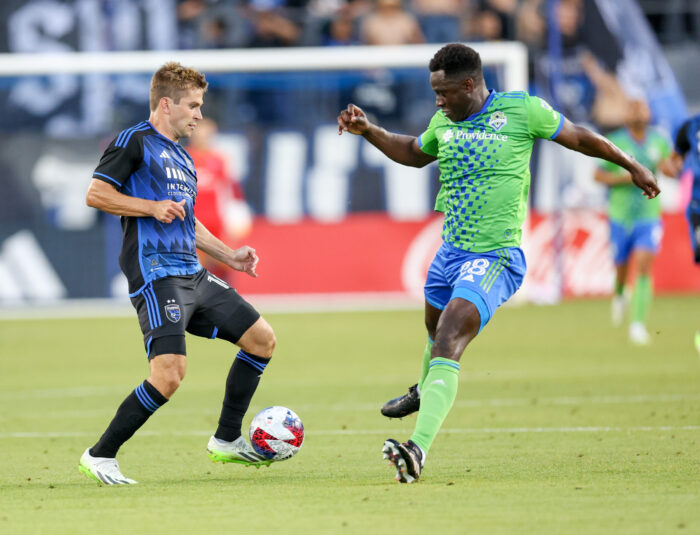 San Jose Earthquakes Midfielder JACK SKAHAN (16) cuts the ball back against Seattle Sounders Defender YEIMAR (28) during the MLS match between the San Jose Earthquakes and the Seattle Sounders at PayPal Park in San Jose, California