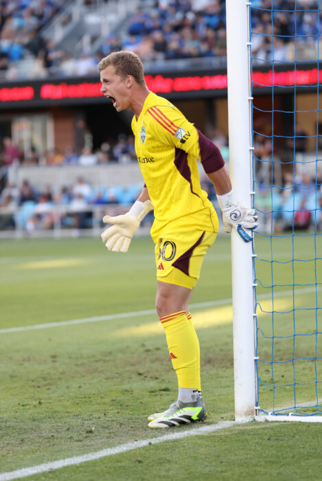Seattle Sounders Goalkeeper STEFAN CLEVELAND (30) yells at his teammates to set up a wall during the MLS match between the San Jose Earthquakes and the Seattle Sounders at PayPal Park in San Jose, California