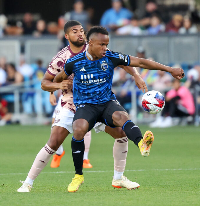 San Jose Earthquakes Forward JEREMY EBOBISSE (11) controls the ball with pressure from Portland Timbers Defender ZAC MCGRAW (18) during the MLS match between the San Jose Earthquakes and the Portland Timbers at PayPal Park in San Jose, California