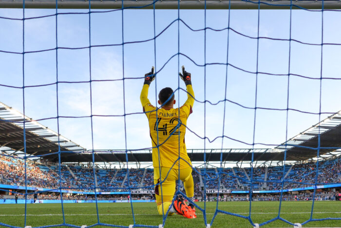 San Jose Earthquakes Goalkeeper DANIEL (42) kneels in the goal before the MLS match between the San Jose Earthquakes and the Portland Timbers at PayPal Park in San Jose, California
