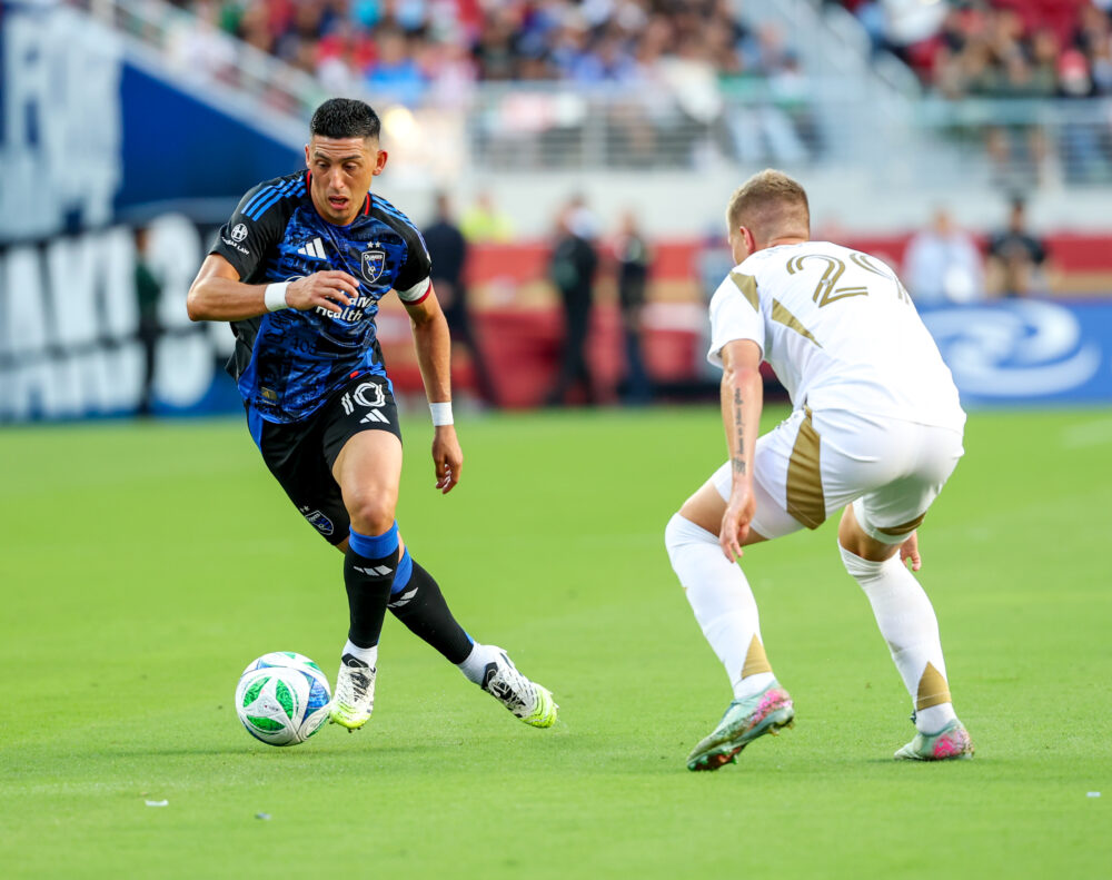 San Jose Earthquakes Midfielder CRISTIAN ESPINOZA (10) drives away from pressure from Los Angeles FC Defender ARTEM SMOLIAKOV (29) during the MLS match between the San Jose Earthquakes and Los Angeles FC at Levi’s Stadium in Santa Clara, California