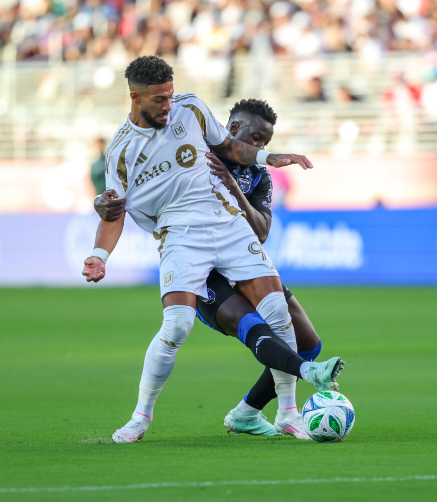 San Jose Earthquakes Midfielder RONY VIEIRA (37) tackles Los Angeles FC Forward DENIS BOUANGA (99) from behind during the MLS match between the San Jose Earthquakes and Los Angeles FC at Levi’s Stadium in Santa Clara, California