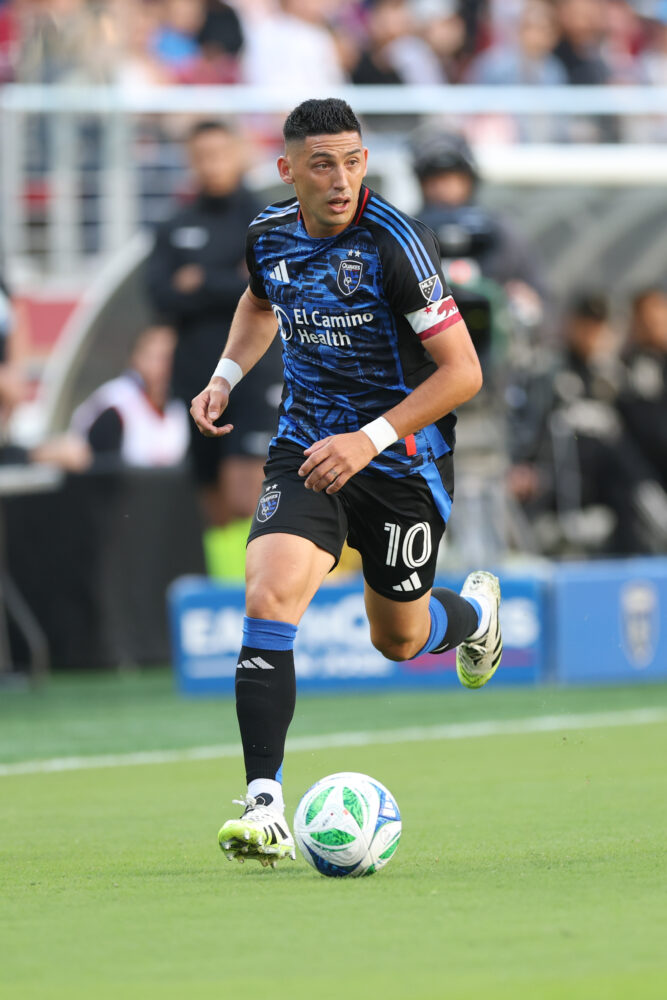 San Jose Earthquakes Midfielder CRISTIAN ESPINOZA (10) dribbles down the side of the field looking for his teammates during the MLS match between the San Jose Earthquakes and Los Angeles FC at Levi’s Stadium in Santa Clara, California