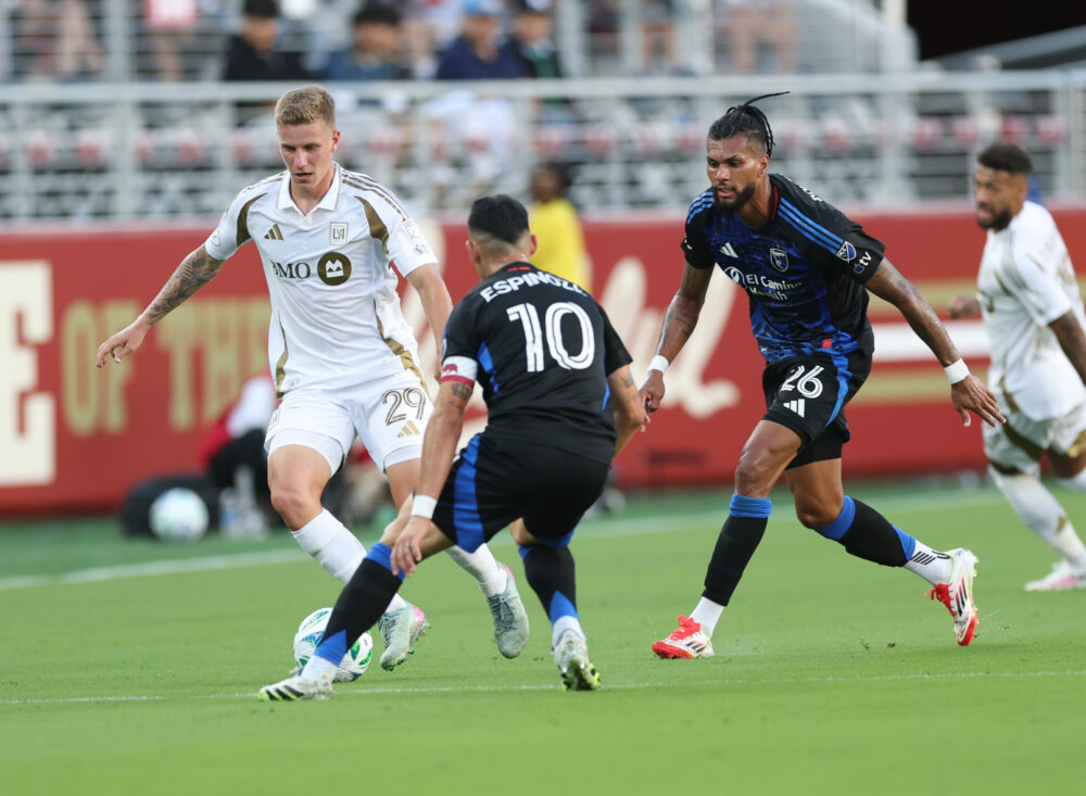 Los Angeles FC Defender ARTEM SMOLIAKOV (29) tries to dribble out of pressure from San Jose Earthquakes Midfielder CRISTIAN ESPINOZA (10) and San Jose Earthquakes Defender RODRIGUES (26) during the MLS match between the San Jose Earthquakes and Los Angeles FC at Levi’s Stadium in Santa Clara, California