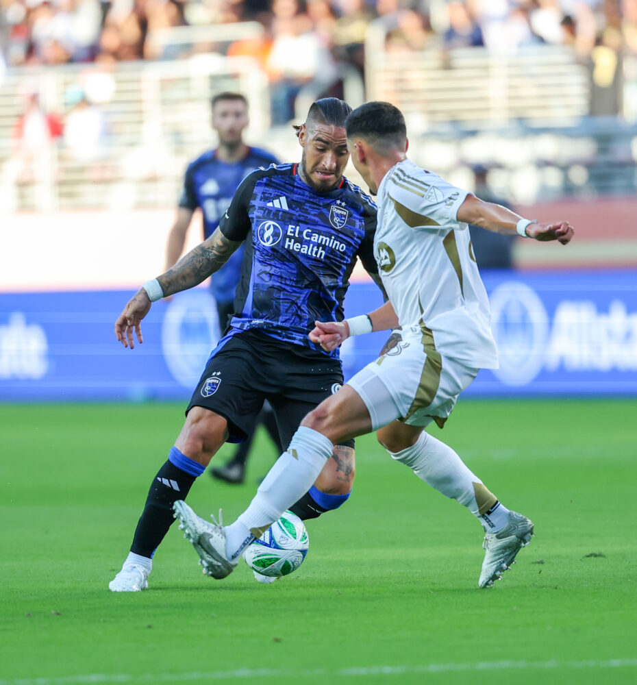 San Jose Earthquakes Forward CHICHO ARANGO (9) cuts back against Los Angeles FC Midfielder MARK DELGADO (8) during the MLS match between the San Jose Earthquakes and Los Angeles FC at Levi’s Stadium in Santa Clara, California