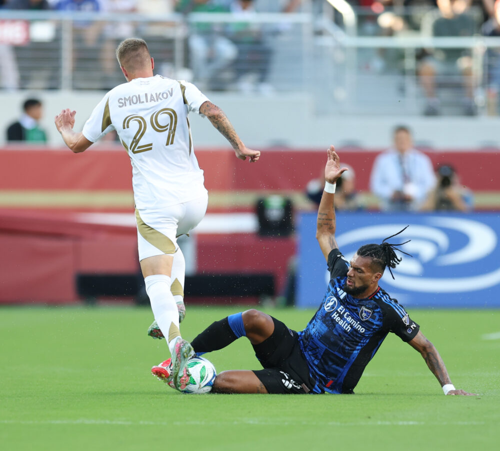 San Jose Earthquakes Defender RODRIGUES (26) slide tackles the ball from Los Angeles FC Defender ARTEM SMOLIAKOV (29) during the MLS match between the San Jose Earthquakes and Los Angeles FC at Levi’s Stadium in Santa Clara, California