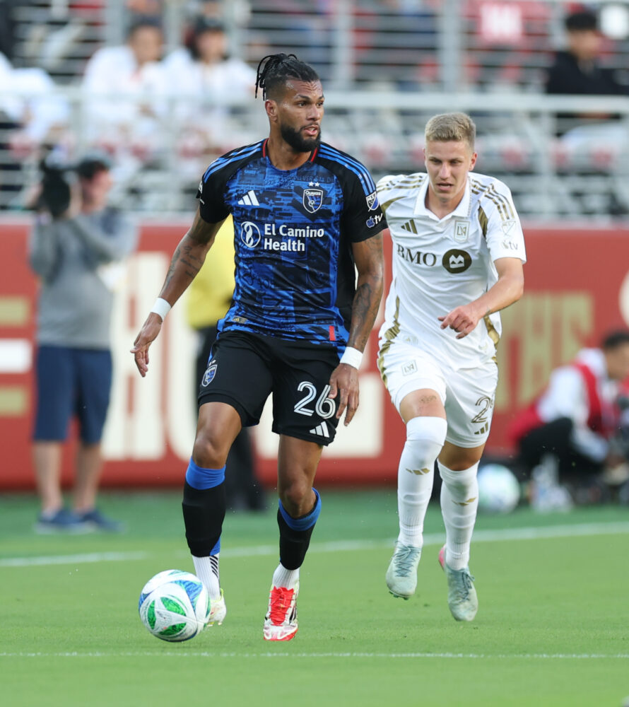 San Jose Earthquakes Defender RODRIGUES (26) looks for a teammate under pressure from Los Angeles FC Defender ARTEM SMOLIAKOV (29) during the MLS match between the San Jose Earthquakes and Los Angeles FC at Levi’s Stadium in Santa Clara, California
