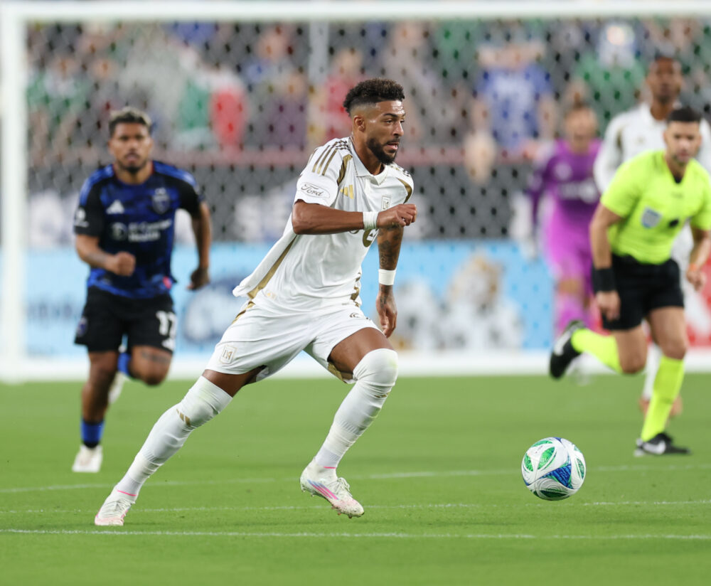 Los Angeles FC Forward DENIS BOUANGA (99) drives the ball across the field during the MLS match between the San Jose Earthquakes and Los Angeles FC at Levi’s Stadium in Santa Clara, California