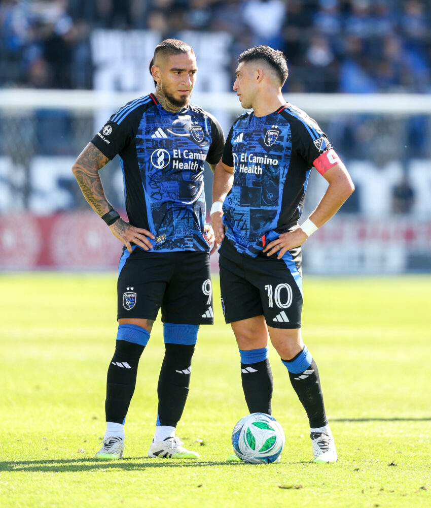 San Jose Earthquakes Forward CHICHO ARANGO (9) and San Jose Earthquakes Midfielder CRISTIAN ESPINOZA (10) discuss a free kick during the MLS match between the San Jose Earthquakes and San Diego FC at PayPal Park in San Jose, California