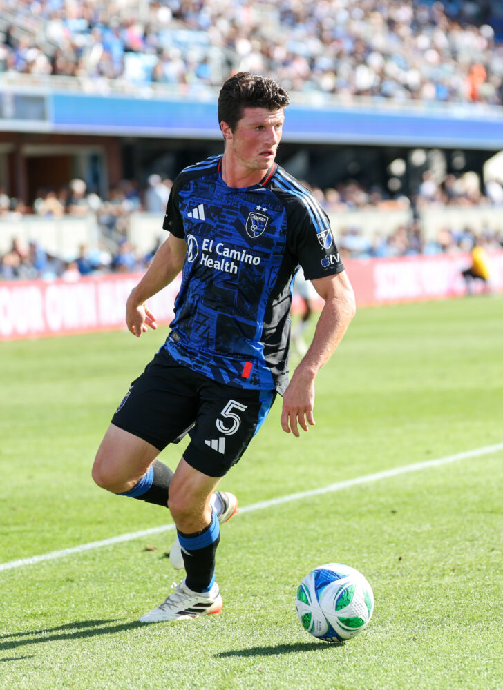San Jose Earthquakes Defender DANIEL MUNIE (5) looks for his options to cross during the MLS match between the San Jose Earthquakes and San Diego FC at PayPal Park in San Jose, California