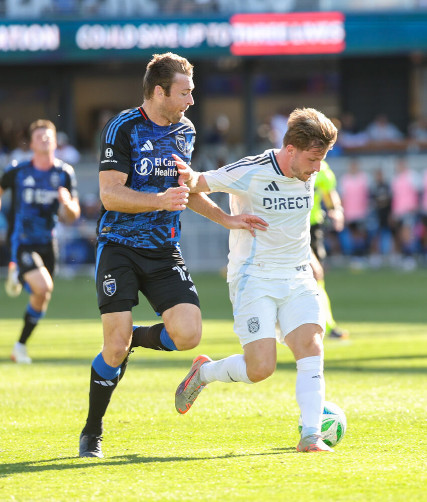 San Diego FC Forward ANDERS DREYER (10) slows the ball under pressure from San Jose Earthquakes Defender DAVE ROMNEY (12) during the MLS match between the San Jose Earthquakes and San Diego FC at PayPal Park in San Jose, California