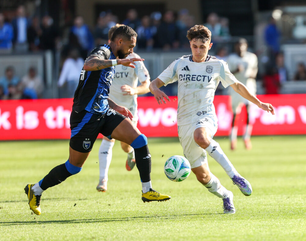 San Jose Earthquakes Defender VITOR COSTA (94) and San Diego FC Defender LUCA BOMBINO (27) challenge for the ball during the MLS match between the San Jose Earthquakes and San Diego FC at PayPal Park in San Jose, California