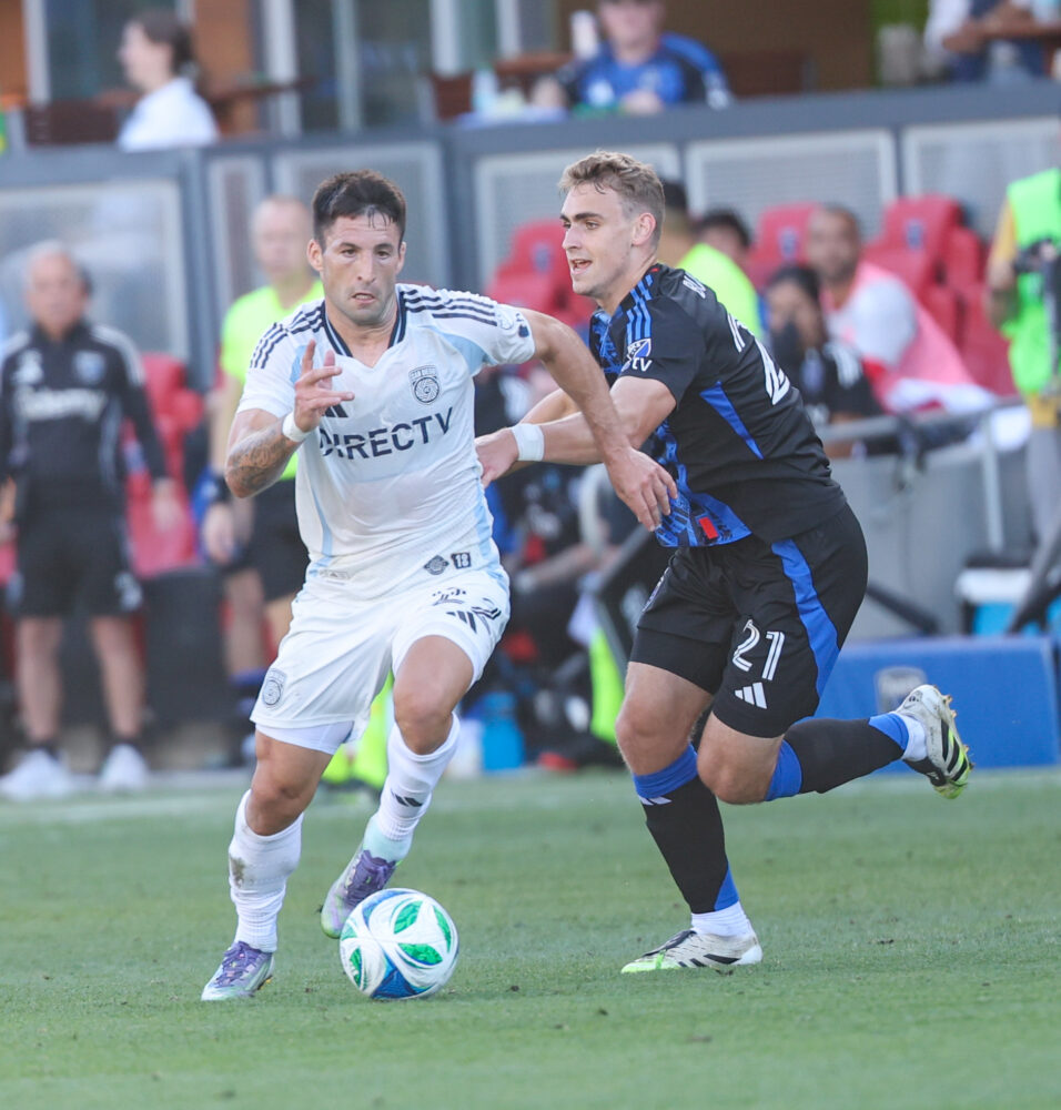 San Diego FC Defender FRANCO NEGRI (22) dribbles away as San Jose Earthquakes Midfielder NOEL BUCK (21) attempts to slow him down with a tug of the shirt during the MLS match between the San Jose Earthquakes and San Diego FC at PayPal Park in San Jose, California