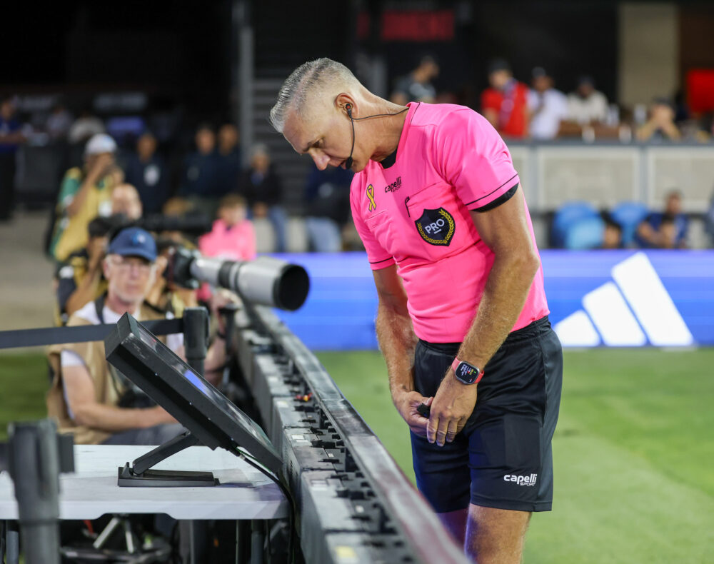 Referee Tim Ford at the VAR monitor to review a play he called a penalty kick for San Jose during the MLS match between the San Jose Earthquakes and the Vancouver Whitecaps at PayPal Park in San Jose, California