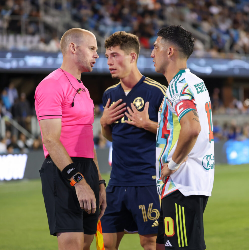 Assistant Referee Chris Elliott chats with San Jose Earthquakes Midfielder CRISTIAN ESPINOZA (10) and Vancouver Whitecaps Midfielder SEBASTIAN BERHALTER (16) during the VAR review during the MLS match between the San Jose Earthquakes and the Vancouver Whitecaps at PayPal Park in San Jose, California