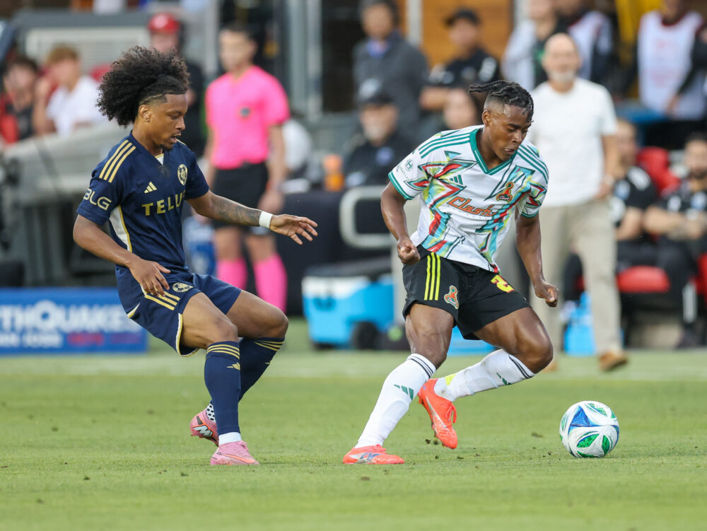 San Jose Earthquakes Defender DEJUAN JONES (22) dribbles away from pressure from Vancouver Whitecaps Forward JAYDEN NELSON (7) during the MLS match between the San Jose Earthquakes and the Vancouver Whitecaps at PayPal Park in San Jose, California