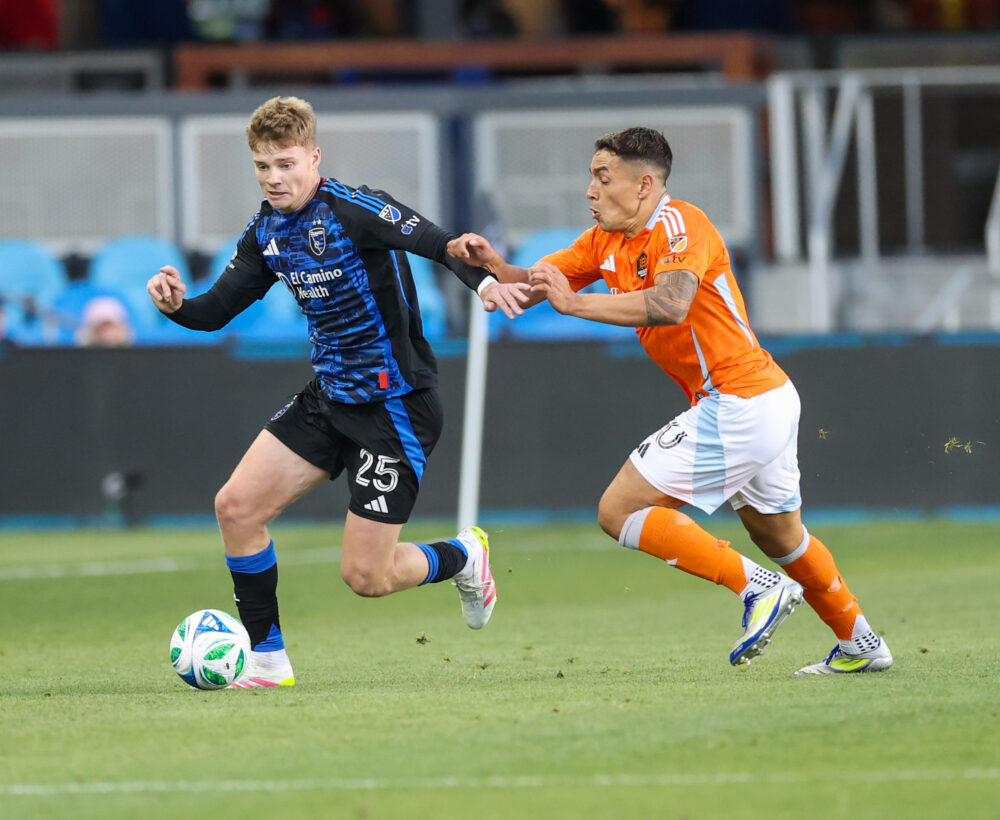 San Jose Earthquakes Defender MAX FLORIANI (25) under pressure from Houston Dynamo FC Forward EZEQUIEL PONCE (10) during the MLS match between the San Jose Earthquakes and Houston Dynamo FC at PayPal Park in San Jose, California