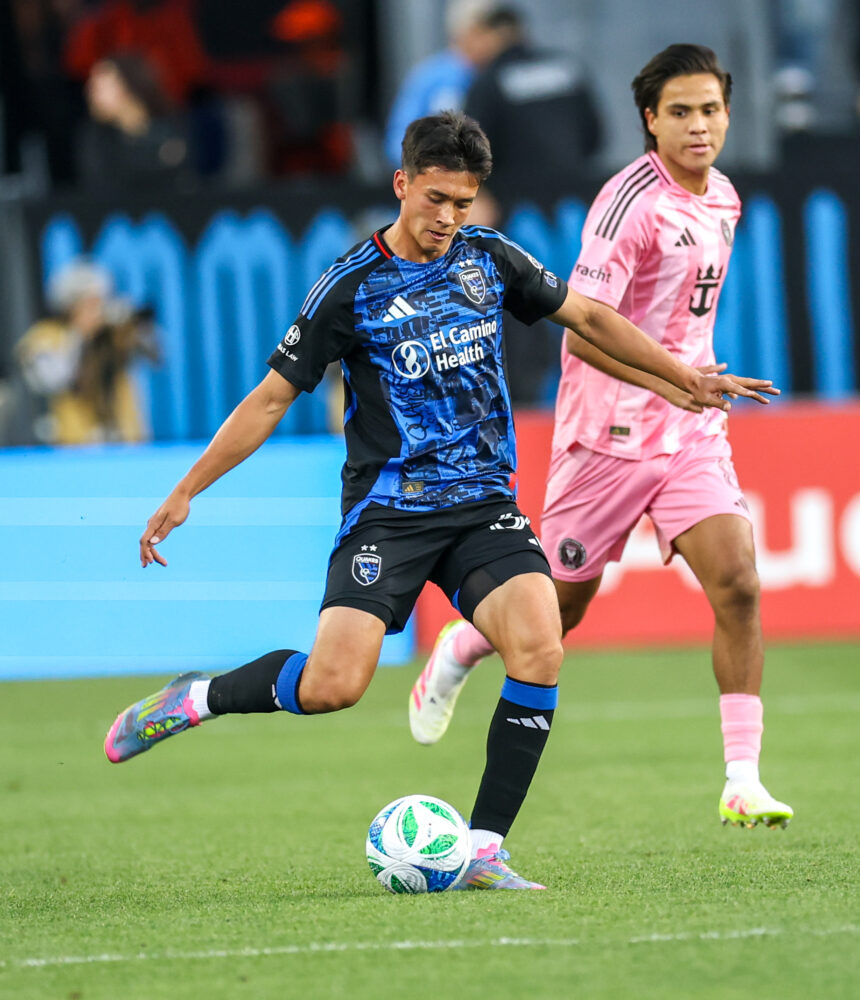 San Jose Earthquakes Midfielder BEAU LEROUX (34) passes the ball upfield with Inter Miami CF Midfielder TELASCO SEGOVIA (8) trailing behind during the MLS match between the San Jose Earthquakes and Inter Miami at PayPal Park in San Jose, California
