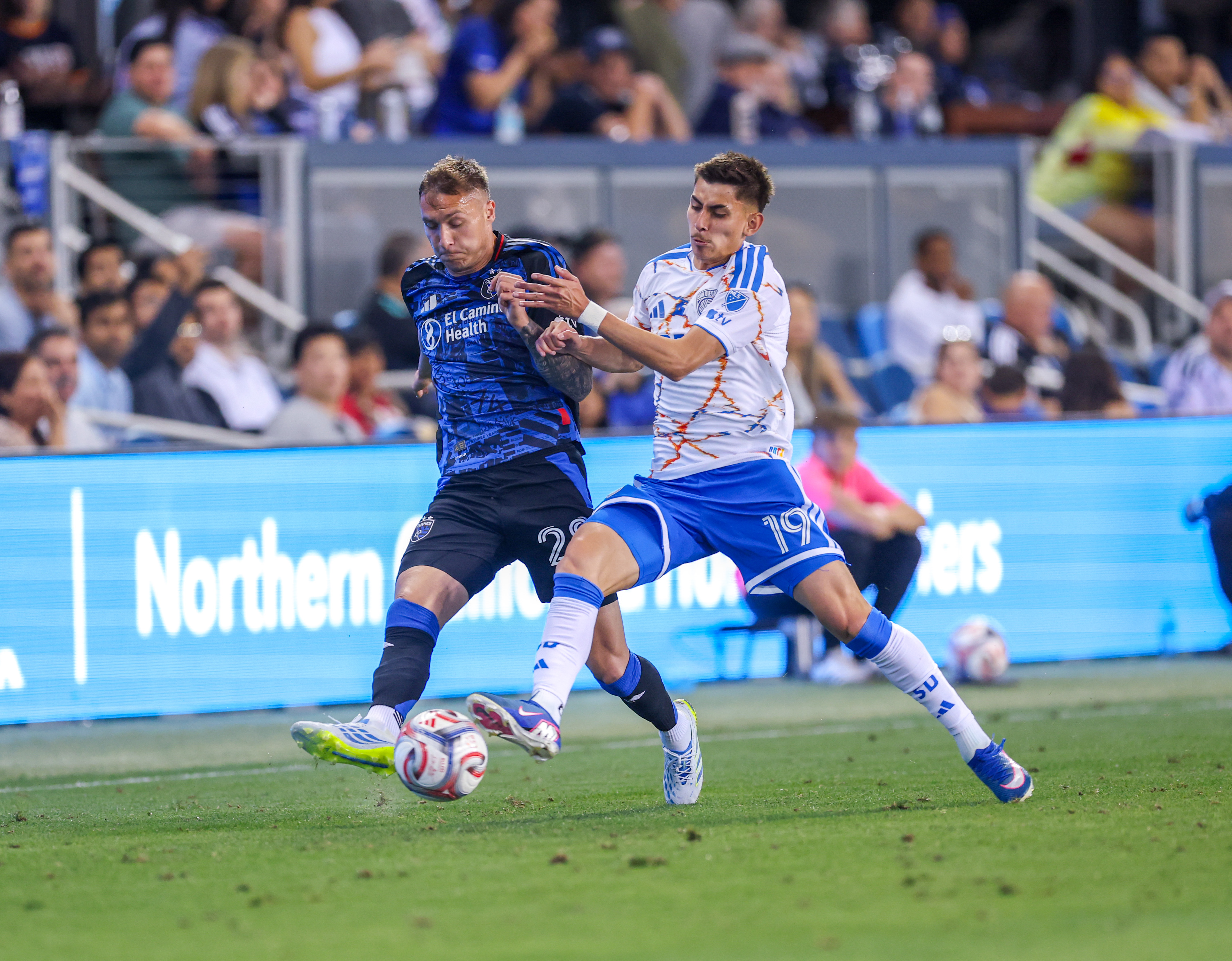 San Diego FC Midfielder DAVID VASQUEZ (19) fouls San Jose Earthquakes Forward BENJI KIKANOVIĆ (28) during the MLS match between the San Jose Earthquakes and San Diego FC at PayPal Park in San Jose, California