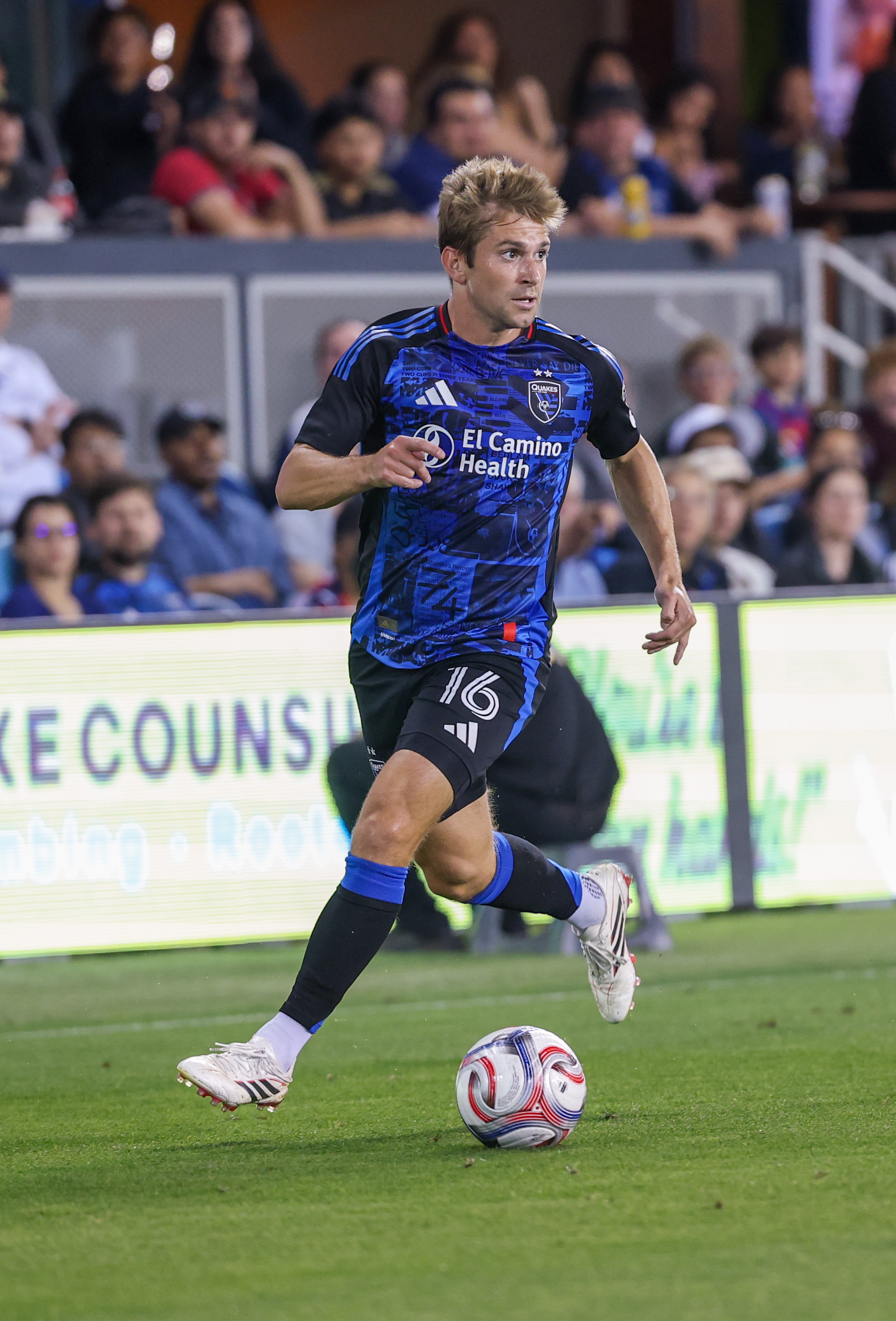 San Jose Earthquakes Midfielder JACK SKAHAN (16) assesses his options during the MLS match between the San Jose Earthquakes and San Diego FC at PayPal Park in San Jose, California