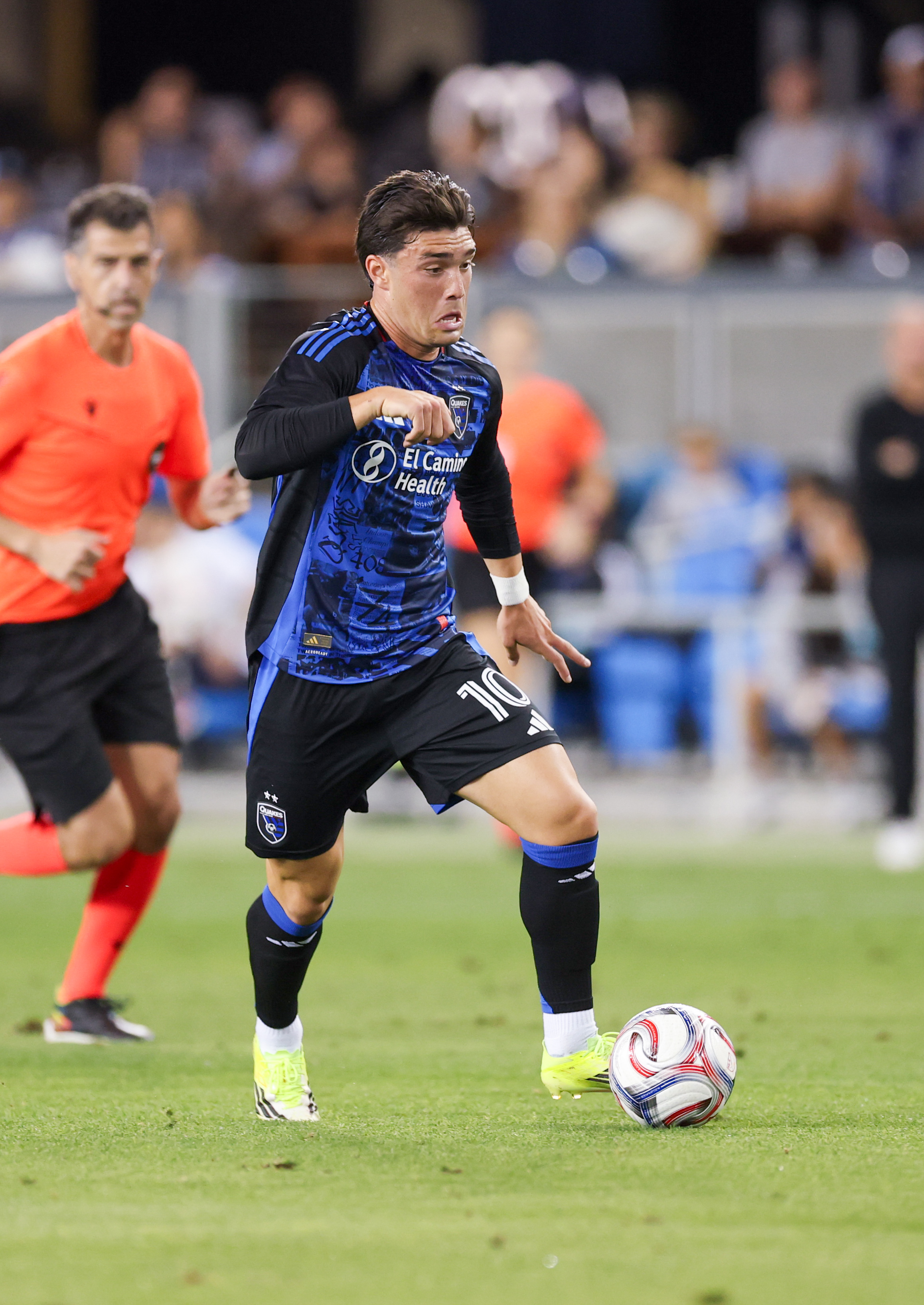 San Jose Earthquakes Midfielder NIKO TSAKIRIS (10) drives the ball through the midfield during the MLS match between the San Jose Earthquakes and San Diego FC at PayPal Park in San Jose, California