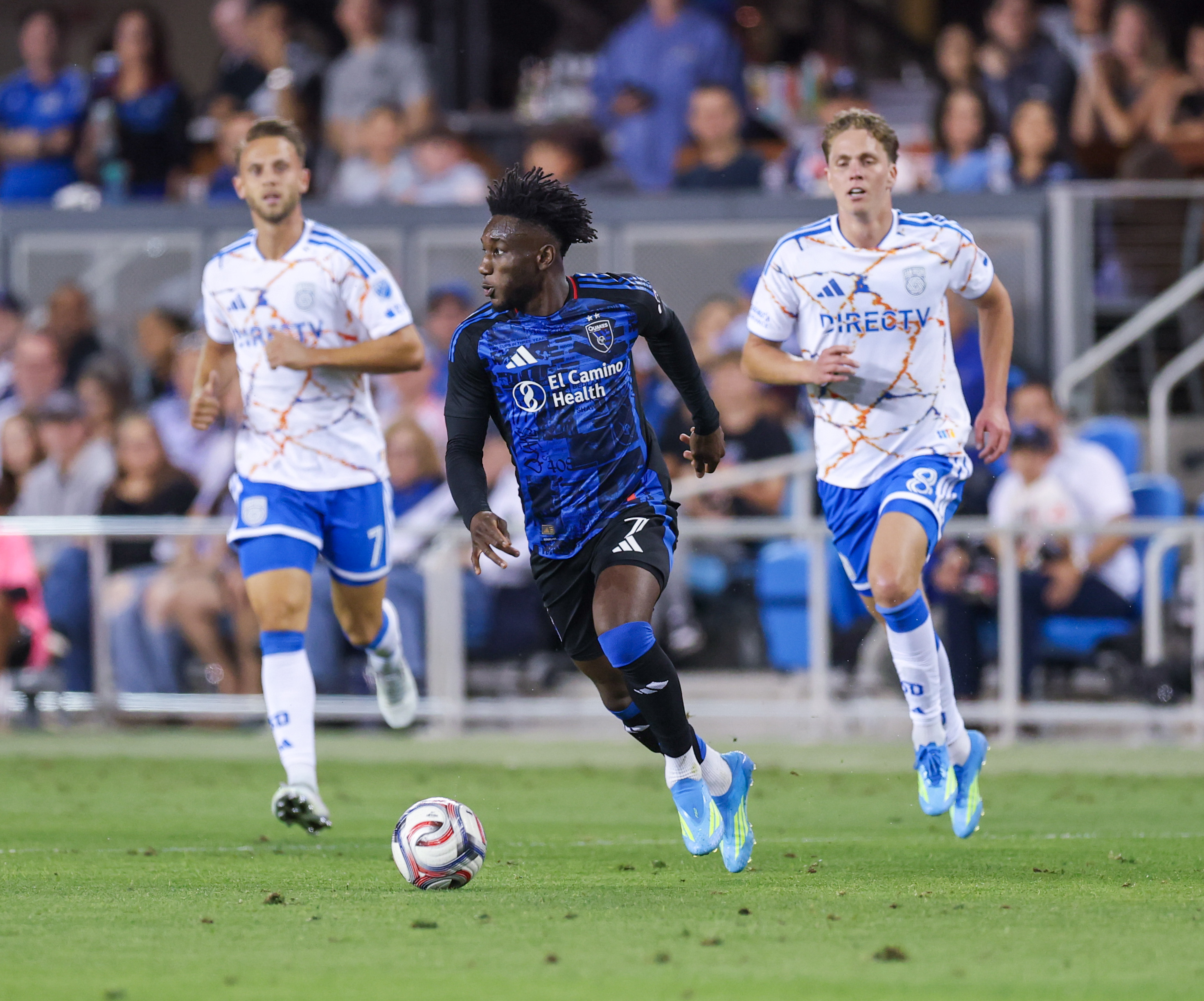 San Jose Earthquakes Forward OUSSENI BOUDA (7) dribbles away from pressure from San Diego FC Forward MARCUS INGVARSTEN (7) and San Diego FC Midfielder ONNI VALAKARI (8) during the MLS match between the San Jose Earthquakes and San Diego FC at PayPal Park in San Jose, California
