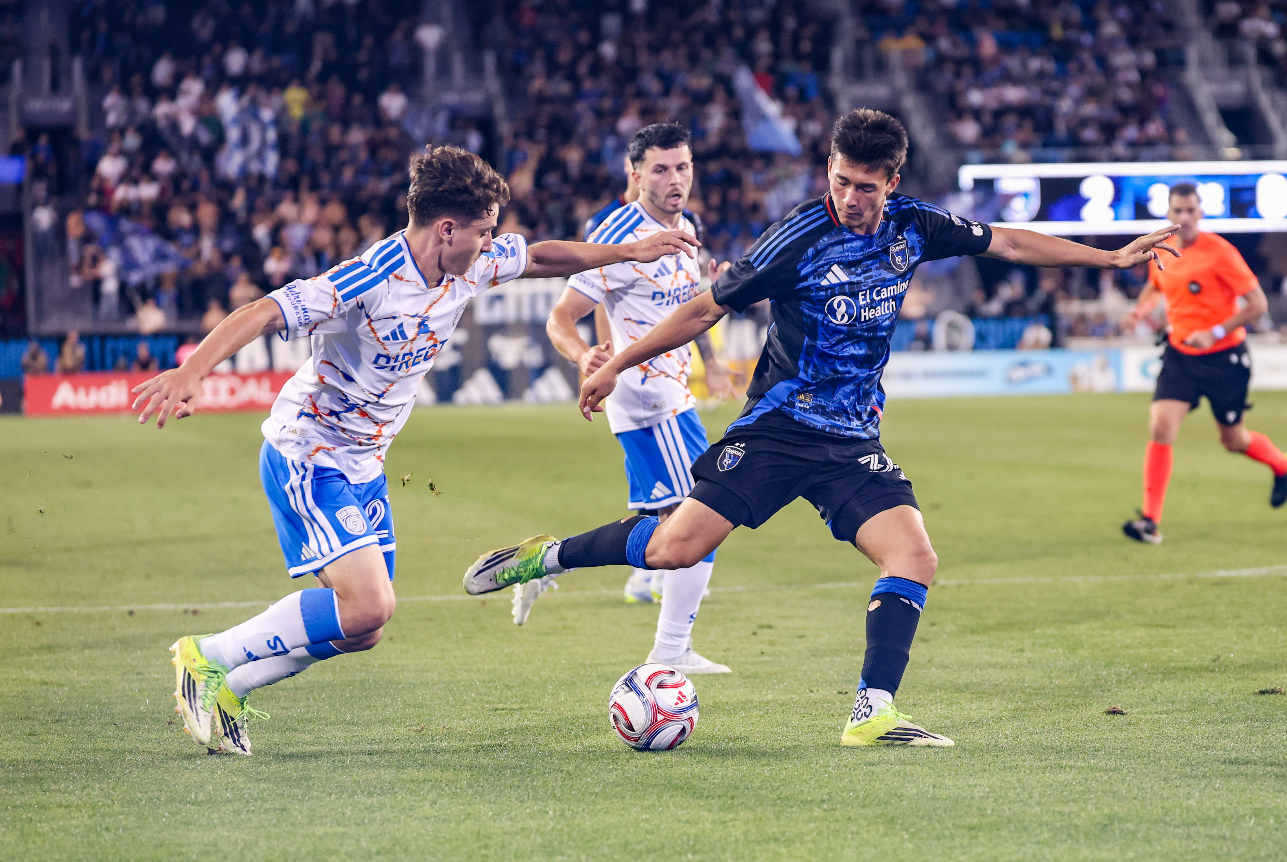 San Jose Earthquakes Midfielder BEAU LEROUX (34) shoots under pressure from San Diego FC Defender LUCA BOMBINO (27) and San Diego FC Forward LEWIS MORGAN (9) during the MLS match between the San Jose Earthquakes and San Diego FC at PayPal Park in San Jose, California