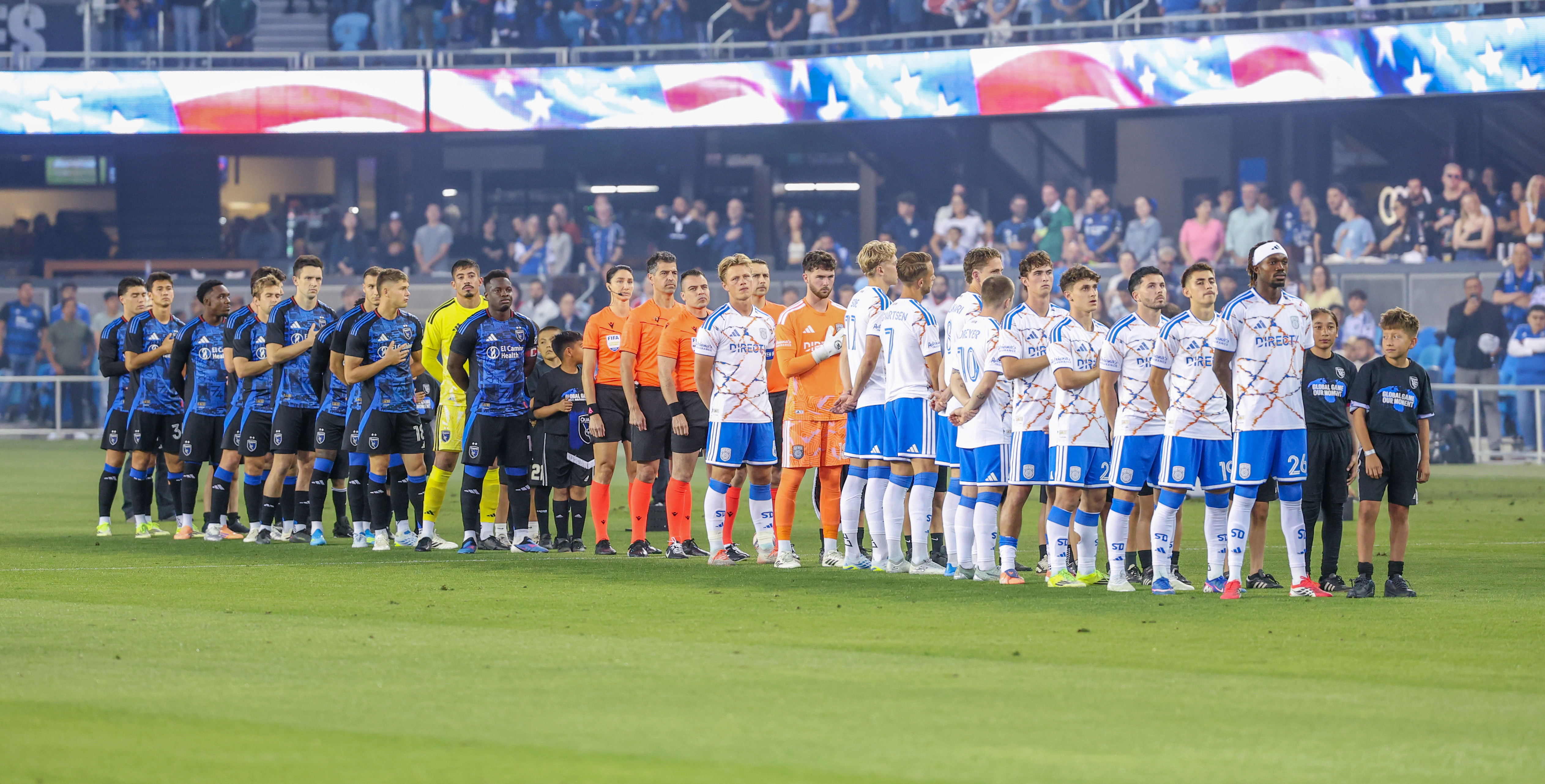 The San Jose Earthquakes and San Diego FC line up for the National Anthem before the MLS match between the San Jose Earthquakes and San Diego FC at PayPal Park in San Jose, California