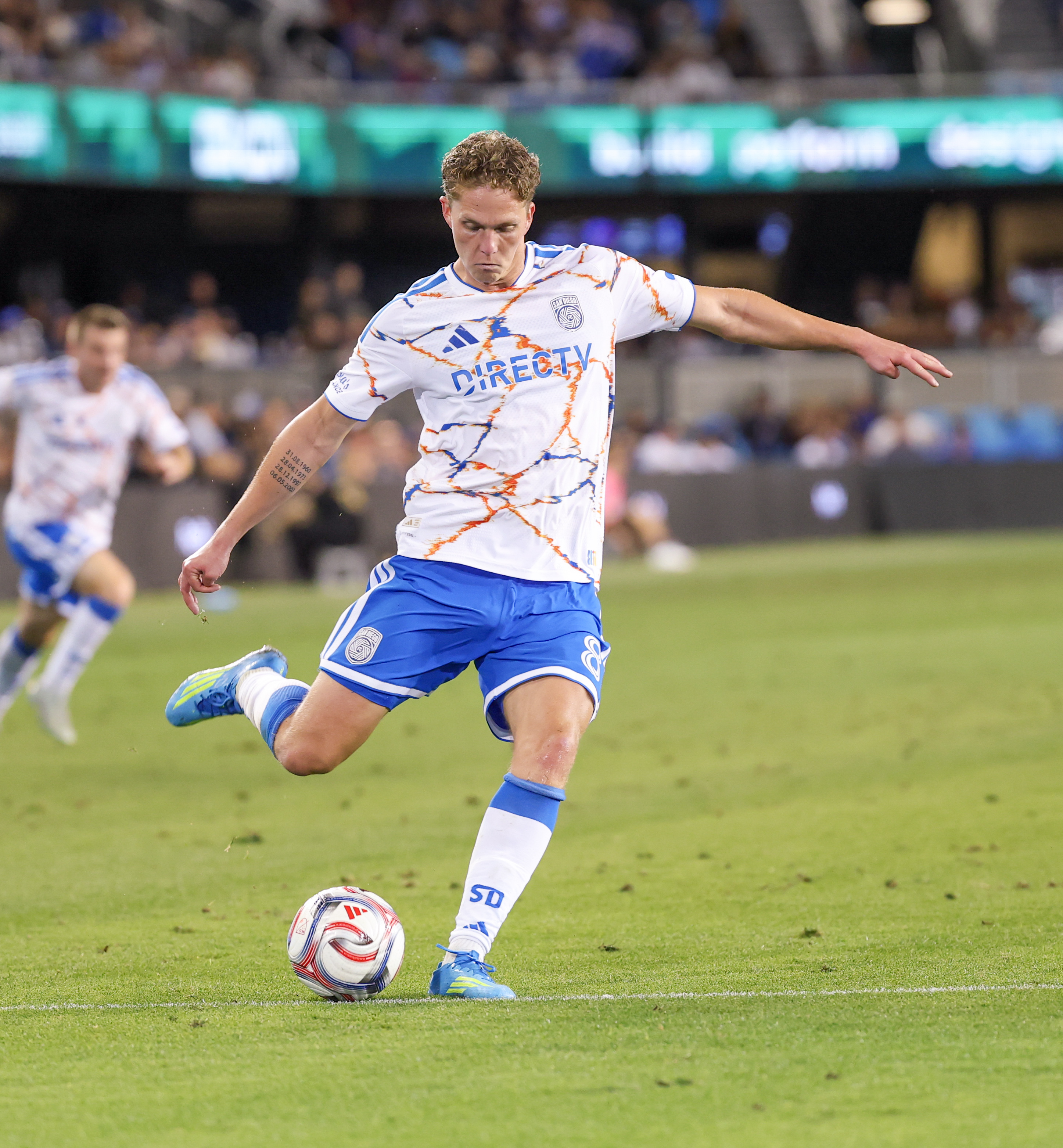 San Diego FC Midfielder ONNI VALAKARI (8) shoots from the top of the box during the MLS match between the San Jose Earthquakes and San Diego FC at PayPal Park in San Jose, California