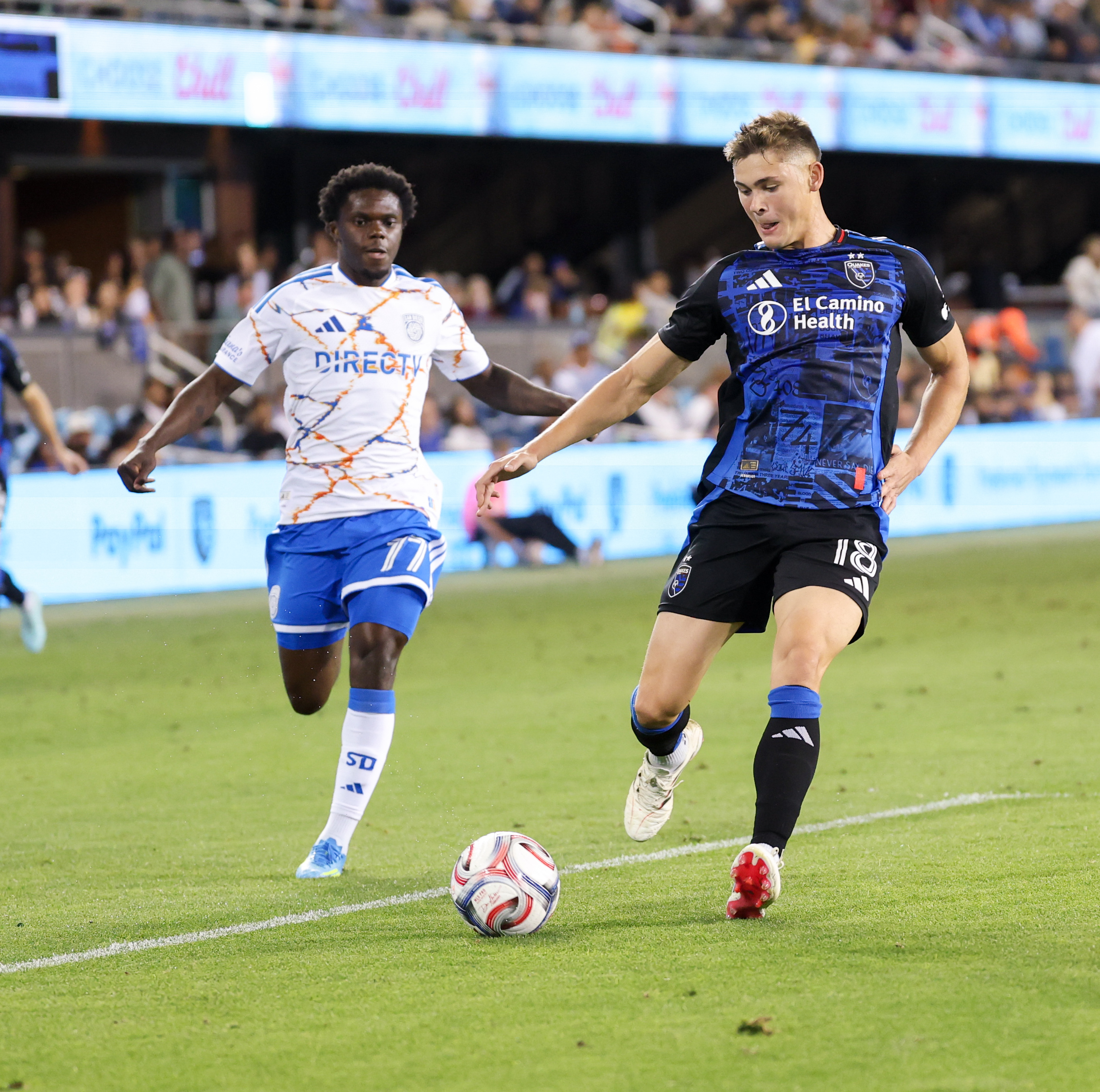 San Jose Earthquakes Defender REID ROBERTS (18) prepares to pass under pressure from San Diego FC Forward ALEX MIGHTEN (77) during the MLS match between the San Jose Earthquakes and San Diego FC at PayPal Park in San Jose, California