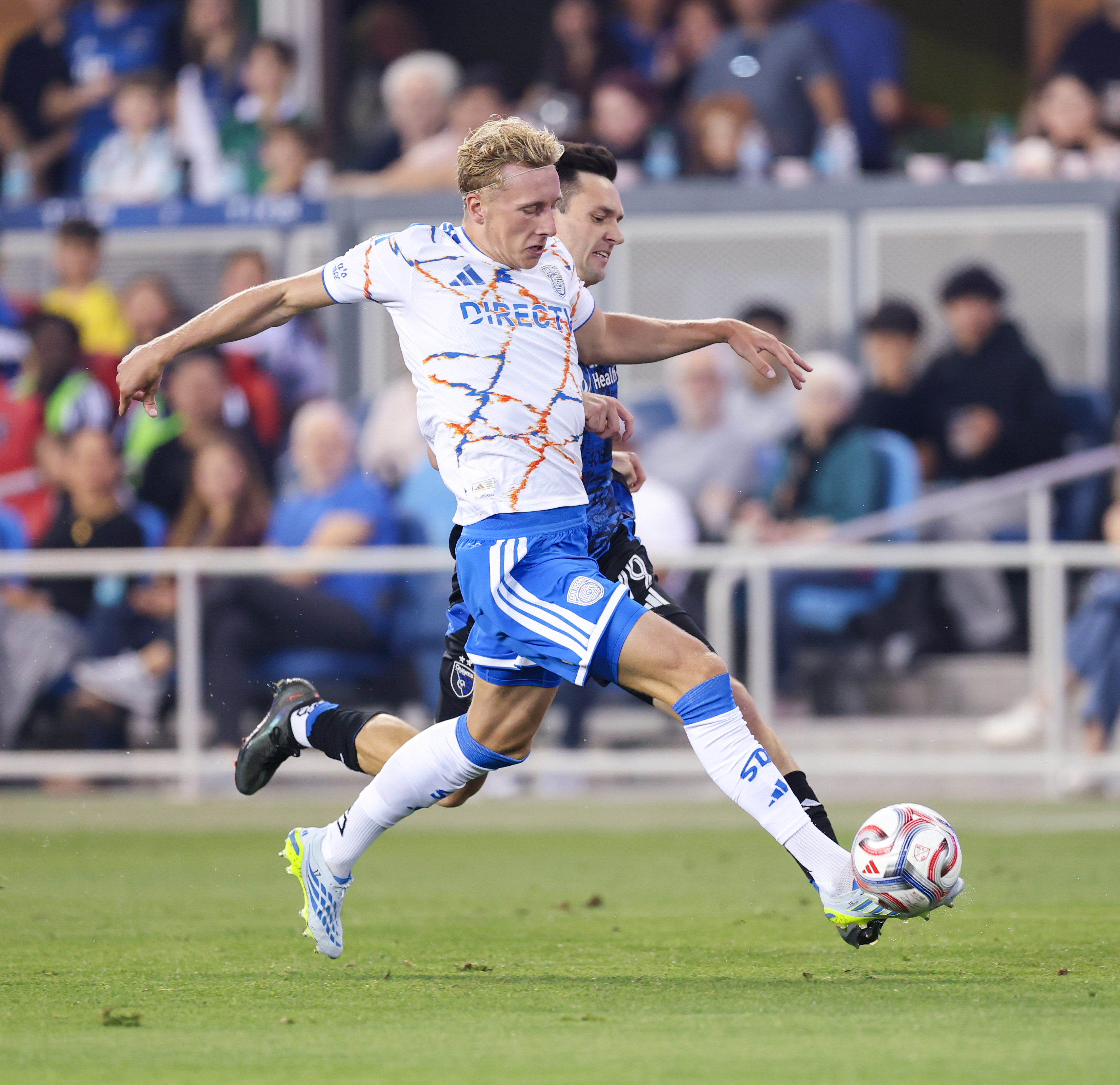 San Diego FC Defender OSVALD SØE (17) clears the ball away from San Jose Earthquakes Forward PRESTON JUDD (19) during the MLS match between the San Jose Earthquakes and San Diego FC at PayPal Park in San Jose, California