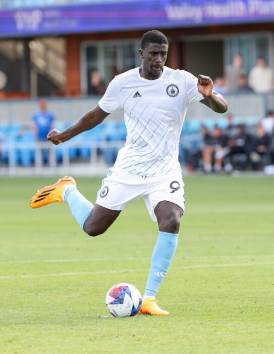 Tacoma Defiance Defender ABDOULAYE CISSOKO (92) shoots a penalty kick during the MLS Next Pro match between the San Jose Earthquakes II and the Tacoma Defiance at PayPal Park in San Jose, California