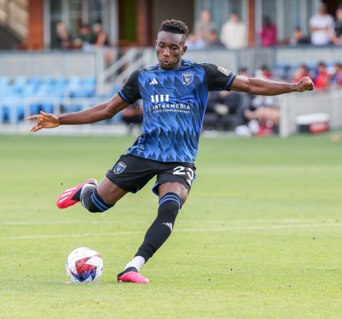 San Jose Earthquakes Forward OUSSENI BOUDA (25) shoots a penalty kick during the MLS Next Pro match between the San Jose Earthquakes II and the Tacoma Defiance at PayPal Park in San Jose, California