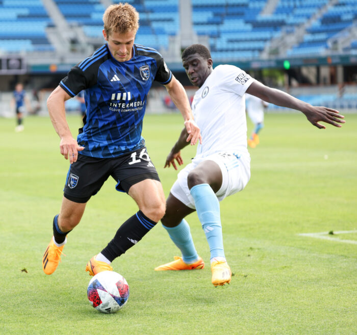 Tacoma Defiance Defender ABDOULAYE CISSOKO (92) challenges San Jose Earthquakes Midfielder JACK SKAHAN (16) in the penalty box during the MLS Next Pro match between the San Jose Earthquakes II and the Tacoma Defiance at PayPal Park in San Jose, California