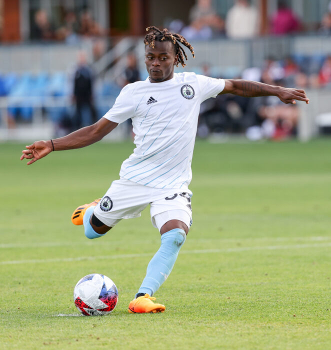Tacoma Defiance Midfielder FRANK DAROMA (34) shoots a penalty kick during the MLS Next Pro match between the San Jose Earthquakes II and the Tacoma Defiance at PayPal Park in San Jose, California