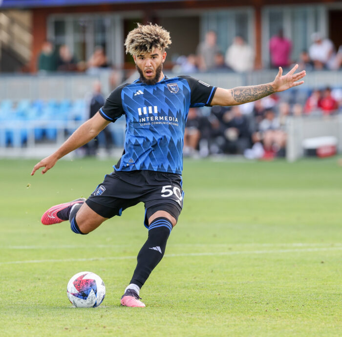 San Jose Earthquakes II Defender AARON EDWARDS (50) shoots a penalty kick during the MLS Next Pro match between the San Jose Earthquakes II and the Tacoma Defiance at PayPal Park in San Jose, California
