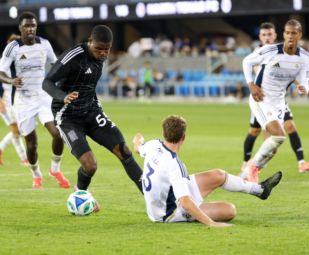 The Town FC Forward NONSO ADIMABUA (55) cuts back against North Texas SC Defender GAVIN GALL (3) during the MLS NEXT PRO match between The Town FC and North Texas SC at PayPal Park in San Jose, California