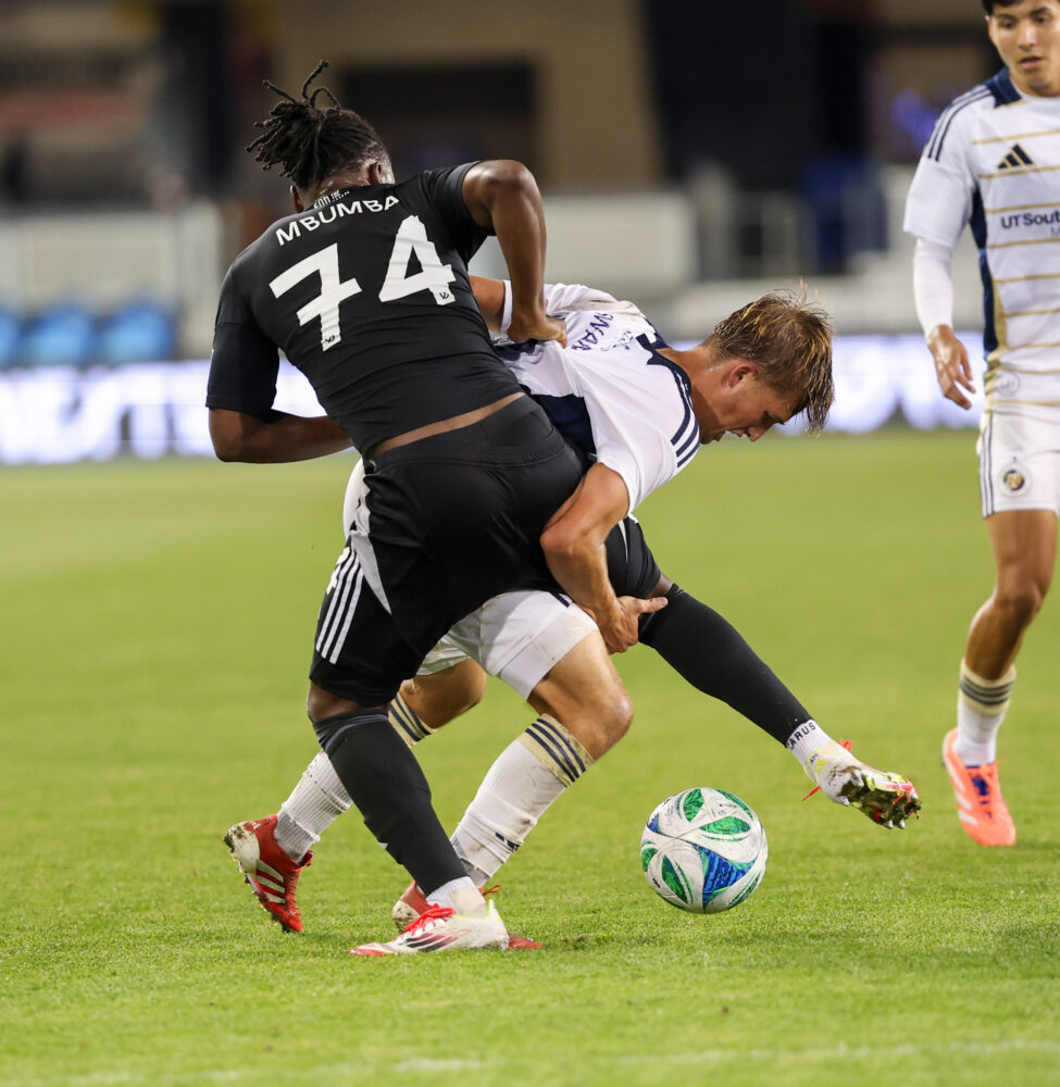North Texas SC Midfielder CALEB SWANN (23) and The Town FC Defender ARIEL MBUMBA (74) battle for the ball during the MLS NEXT PRO match between The Town FC and North Texas SC at PayPal Park in San Jose, California