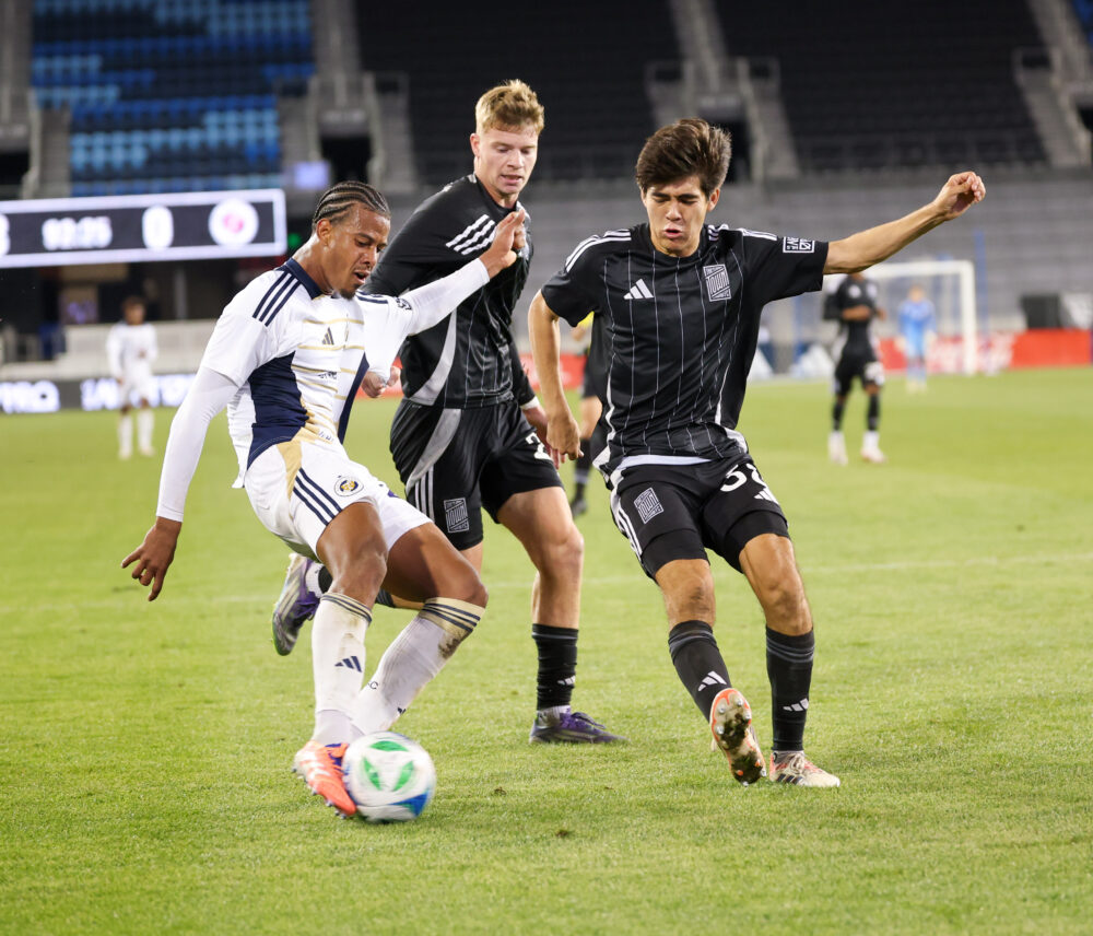 North Texas SC Defender ÁLVARO (22) shoots the ball under pressure from The Town FC Midfielder EDWYN MENDOZA (38) and The Town FC Defender MAX FLORIANI (25) during the MLS NEXT PRO match between The Town FC and North Texas SC at PayPal Park in San Jose, California