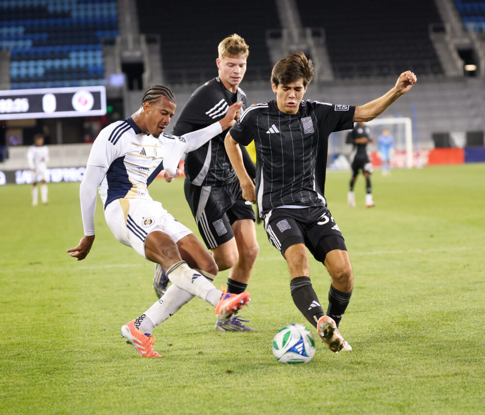The Town FC Midfielder EDWYN MENDOZA (38) blocks a shot from North Texas SC Defender ÁLVARO (22) during the MLS NEXT PRO match between The Town FC and North Texas SC at PayPal Park in San Jose, California