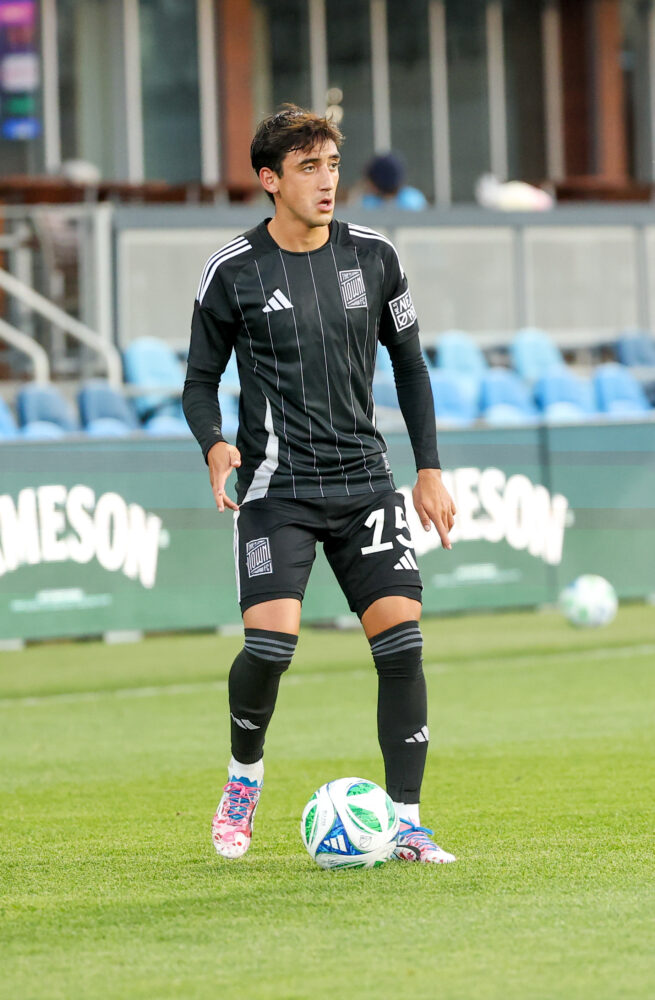 The Town FC Midfielder CRUZ MEDINA (15) looks for a teammate during the MLS NEXT PRO match between The Town FC and North Texas SC at PayPal Park in San Jose, California