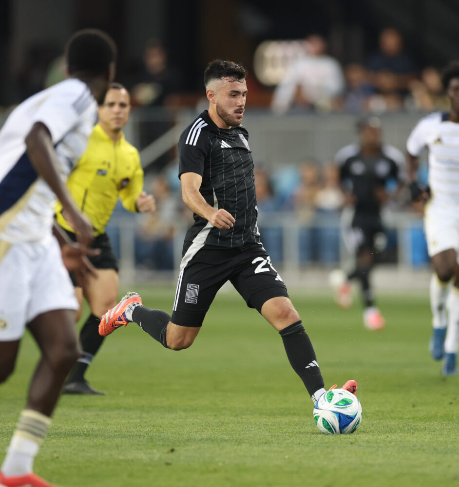 The Town FC Midfielder NICK FERNANDEZ (20) drives up the center of the field during the MLS NEXT PRO match between The Town FC and North Texas SC at PayPal Park in San Jose, California