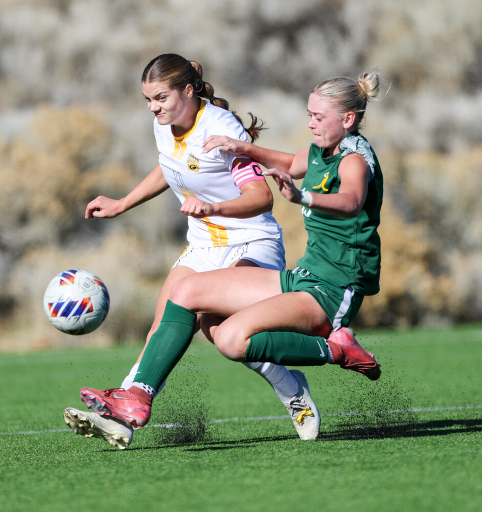 Galena’s Alyssa Dixon crosses the ball under pressure from Bishop Manogue’s Ella Bradley during the game between the Galena Grizzlies and the Bishop Manogue Miners, Bishop Manogue High School, Reno, NV