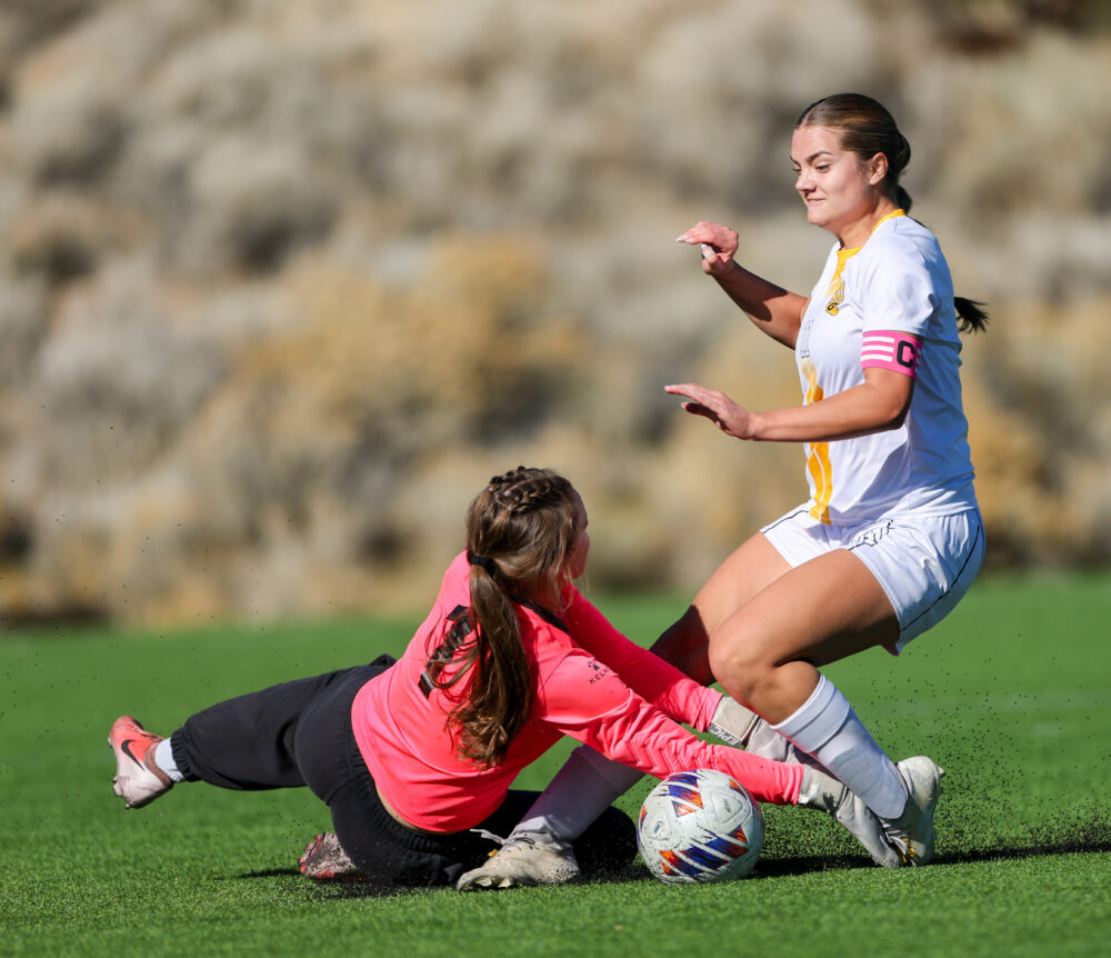 Bishop Manogue’s goalkeeper Josie Williamson tackles the ball away from Galena’s Alyssa Dixon during the game between the Galena Grizzlies and the Bishop Manogue Miners, Bishop Manogue High School, Reno, NV