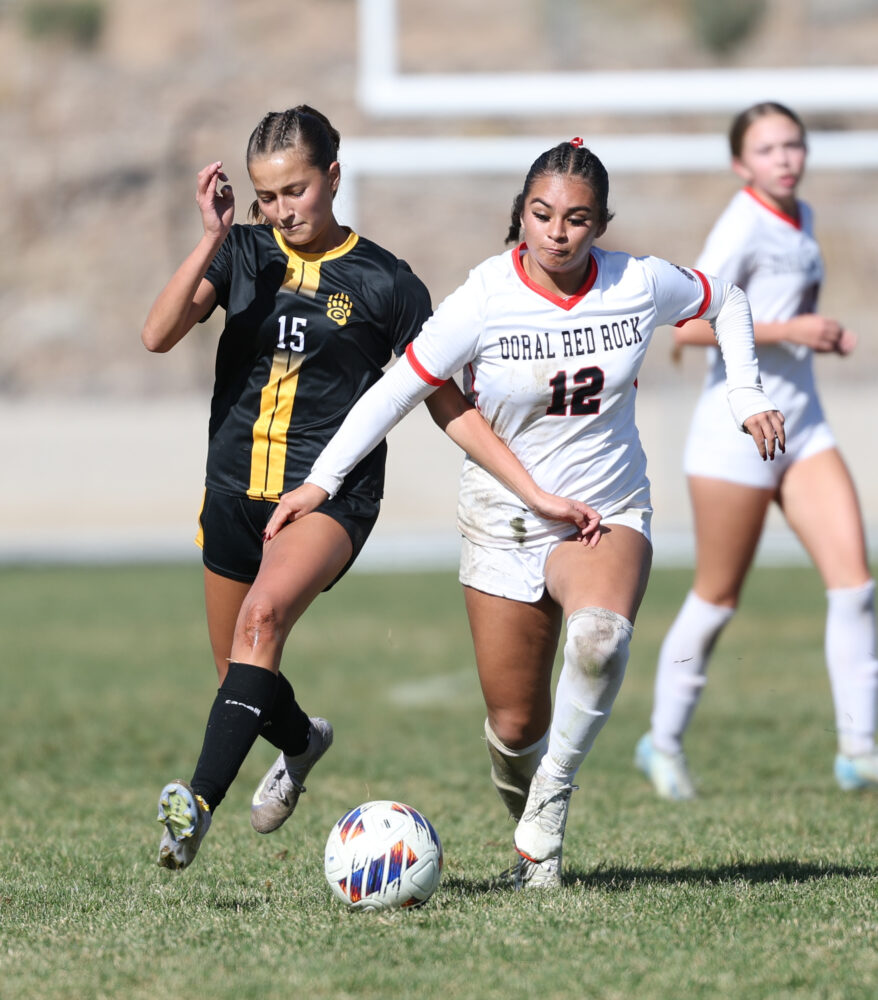 Doral Red Rock’s Dasha Rosas and Galena’s Carrigan Bruntz battle for the ball during the NIAA State Championship game between the Doral Academy Red Rock Dragons and the Galena Grizzlies, Hug High School, Reno, NV