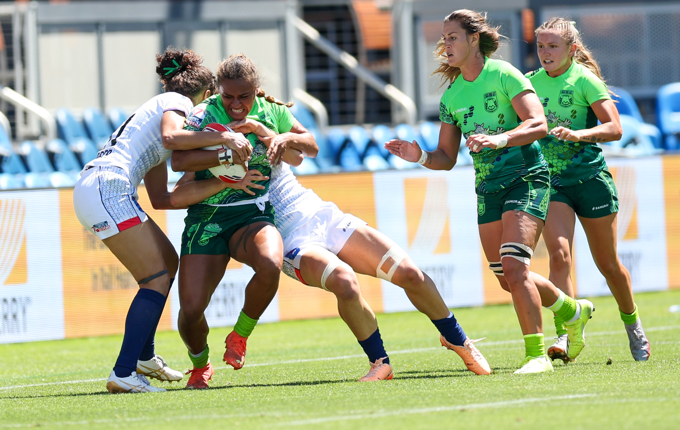 Rhino x Loggerheads ALI NAMOSIMALUA (9) tries to break a tackle from the Loonies players during the Premier Rugby Sevens Western Conference Finals at PayPal Park in San Jose, California