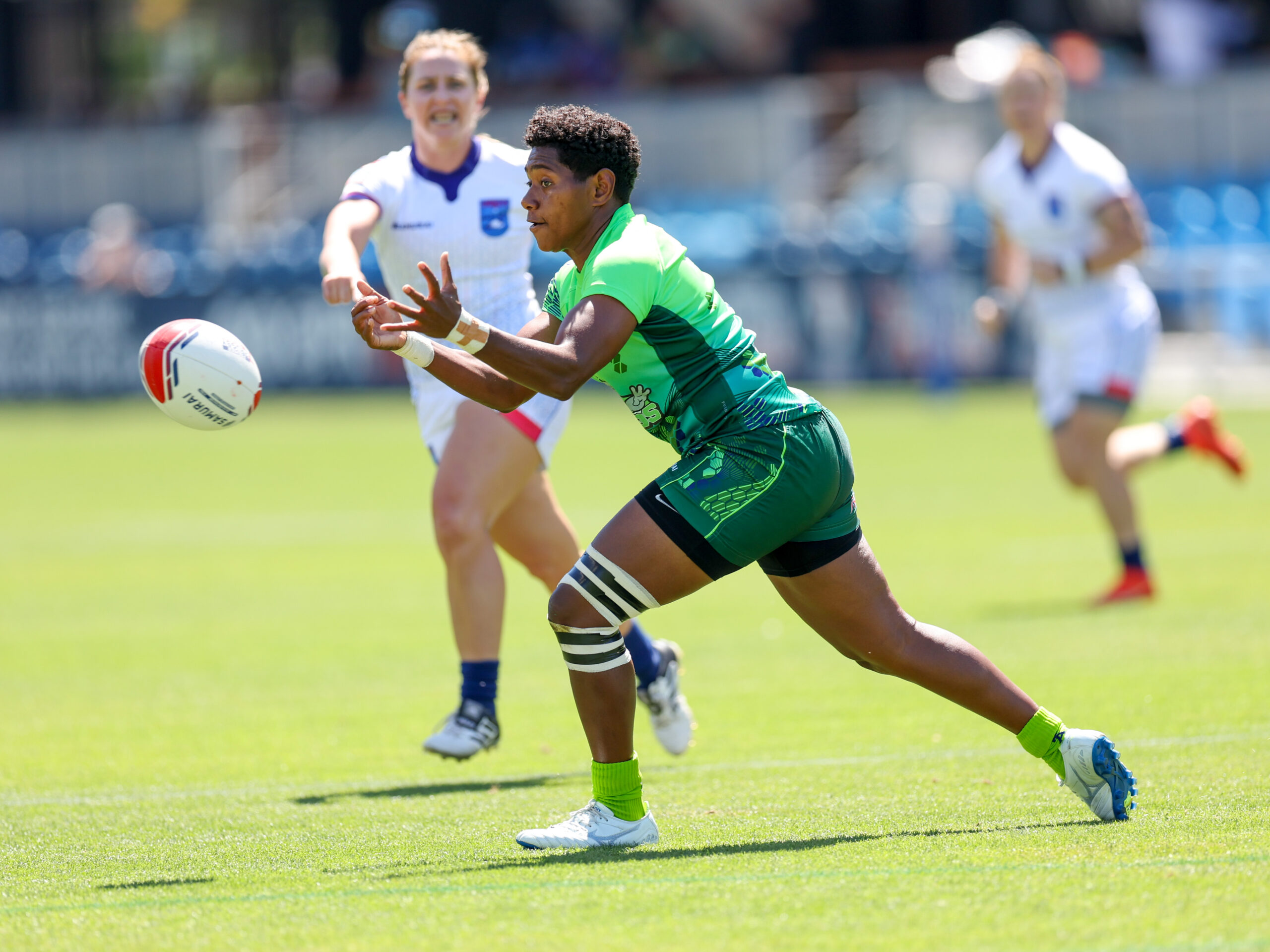 Rhino x Loggerheads REAPI ULINISAU (4) passes the ball during the Premier Rugby Sevens Western Conference Finals at PayPal Park in San Jose, California