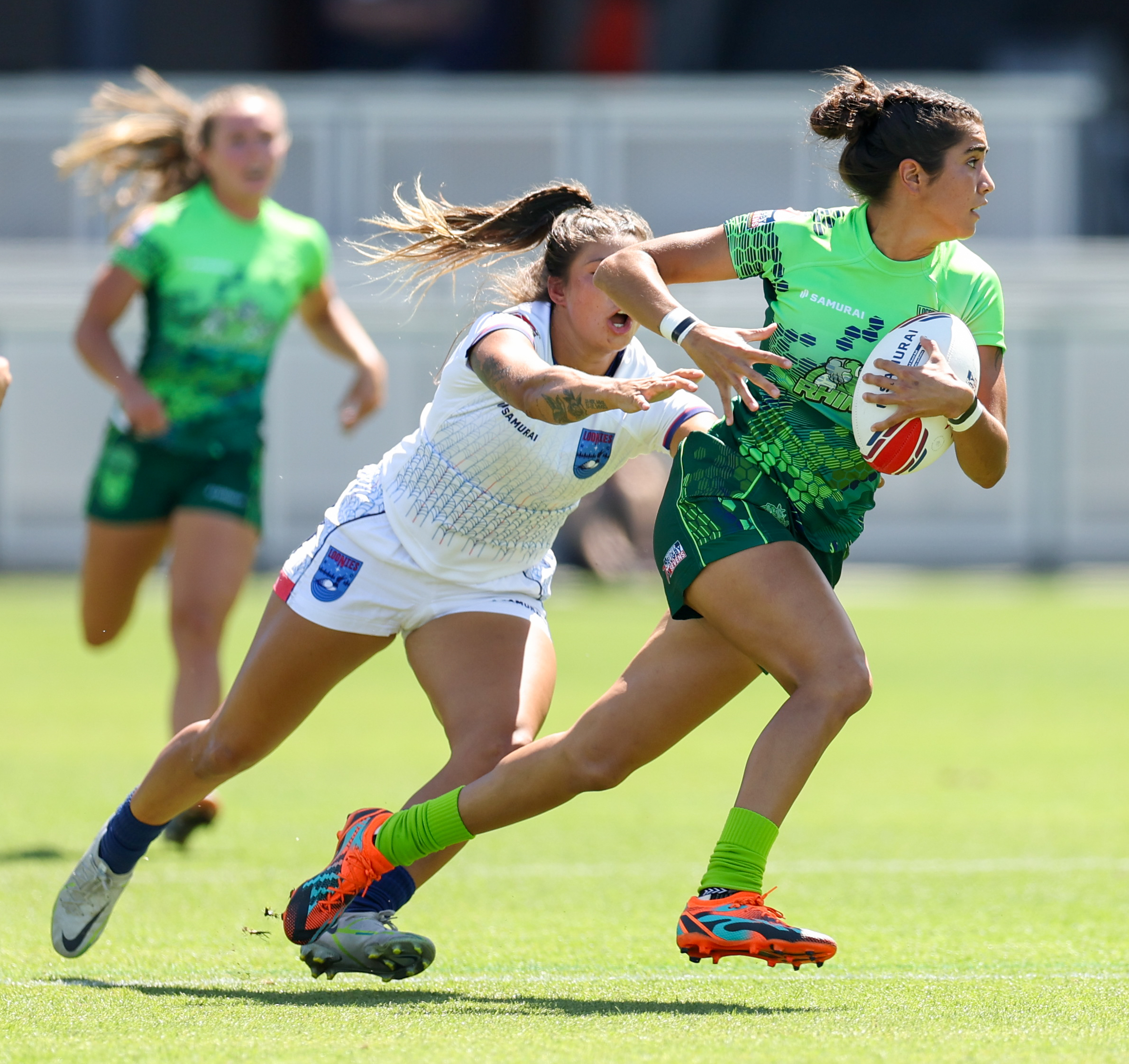 Rhino x Loggerheads KARINA GAUTO (11) eludes a tackle from Northern Loonies SHALAYA VALENZUELA (10) during the Premier Rugby Sevens Western Conference Finals at PayPal Park in San Jose, California