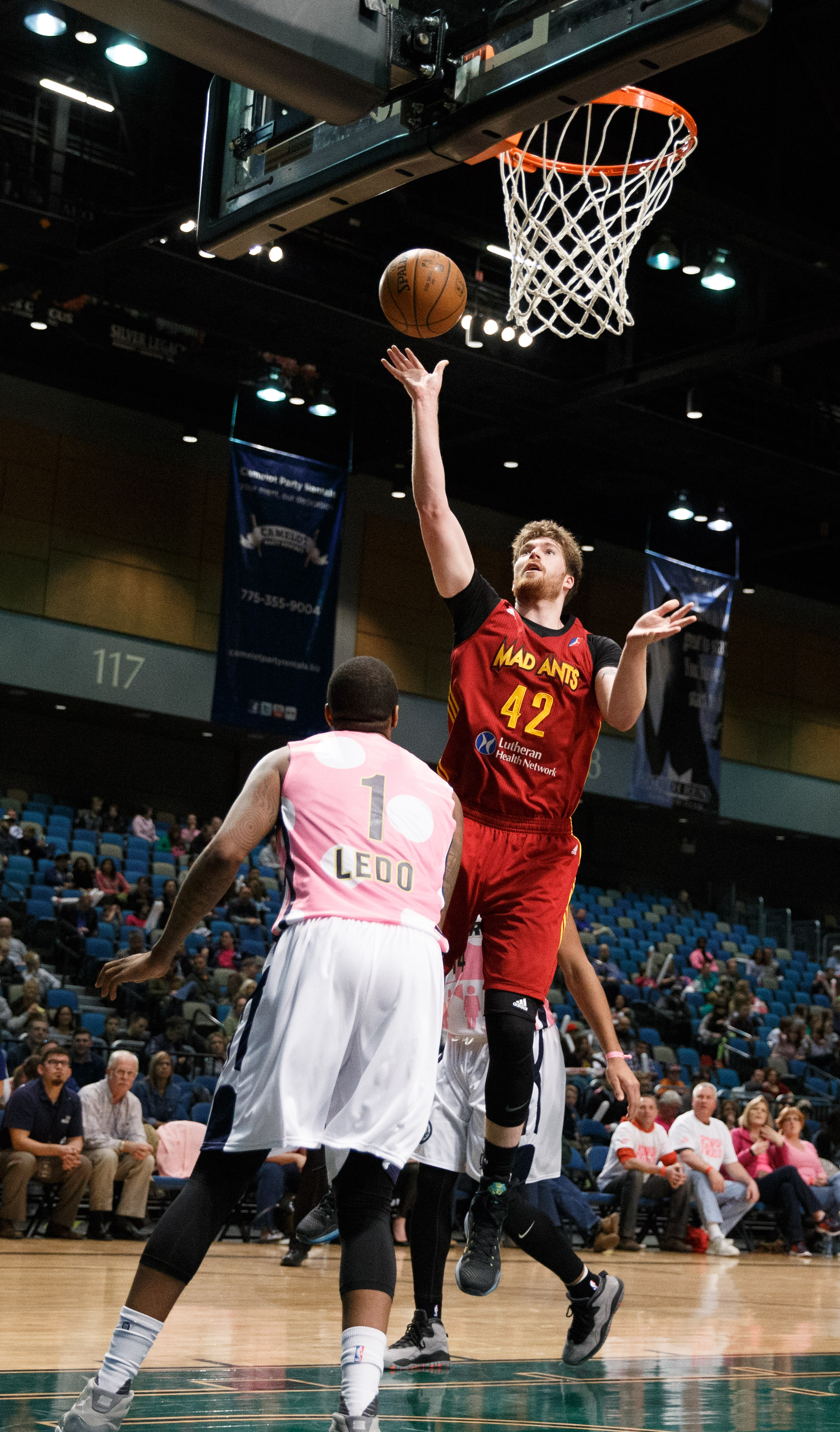 Fort Wayne Mad Ant Forward SHAYNE WHITTINGTON (42) shoots a layup against Reno Bighorn Guard RICKY LEDO (1) during the NBA D-League Basketball game between the Reno Bighorns and the Fort Wayne Mad Ants at the Reno Events Center in Reno, Nevada.