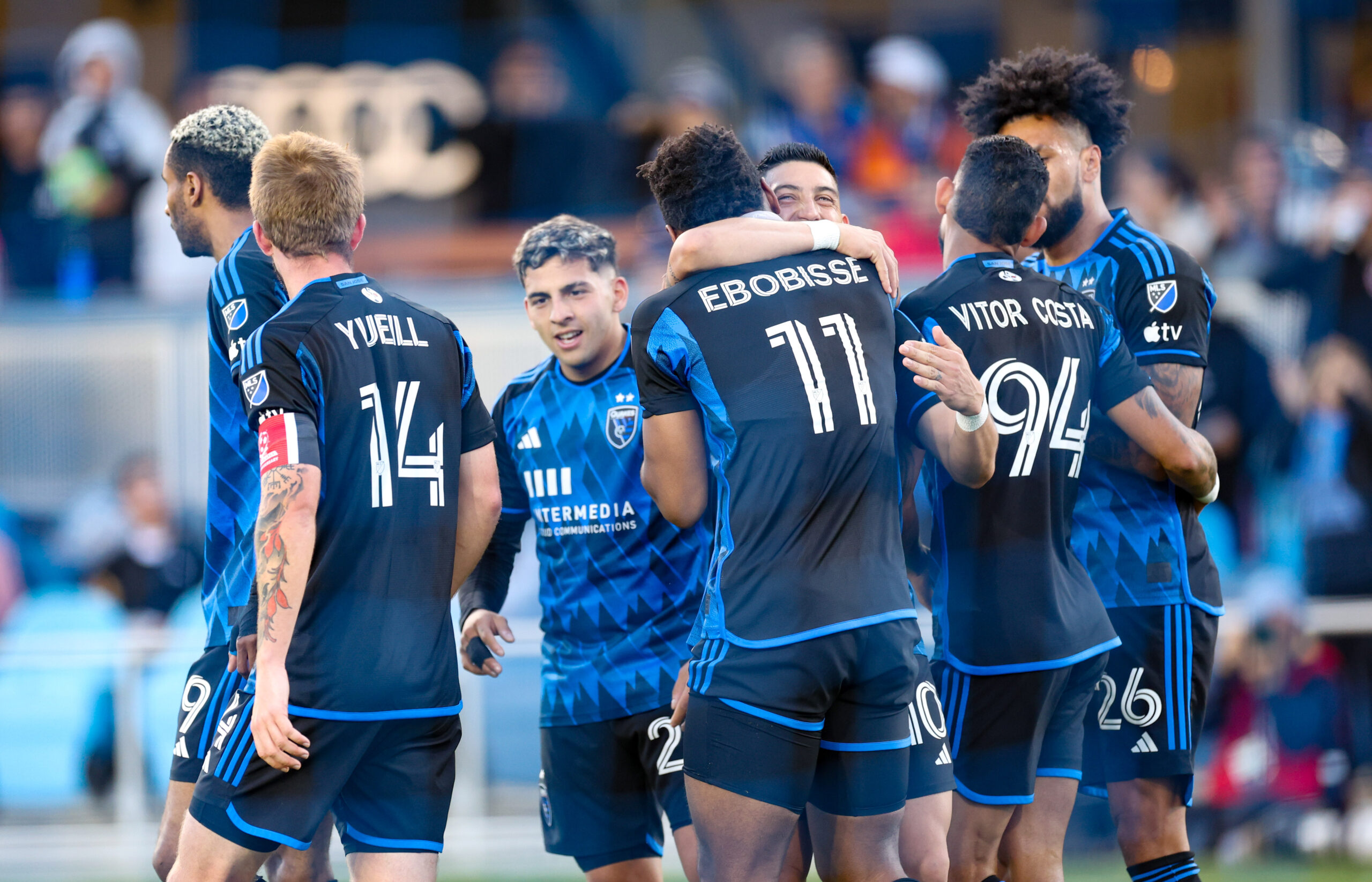 San Jose Earthquakes Midfielder CRISTIAN ESPINOZA (10) with a congratulatory hug for San Jose Earthquakes Forward JEREMY EBOBISSE (11) after his goal early in the MLS match between the San Jose Earthquakes and Austin FC at PayPal Park in San Jose, California